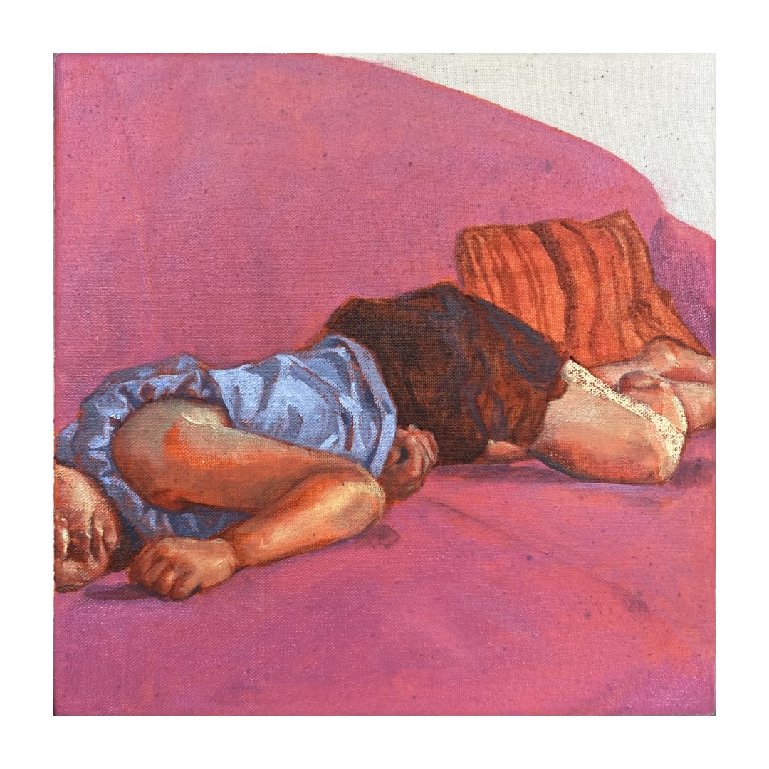 What I really wanted to show in this painting was a sort of weighted feeling. I have such vivid memories of laying still on the couch or in a chair, the world existing behind my eyelids, but me not participating. Knowing you had to move eventually but needing that feeling to last at least a little bit longer.